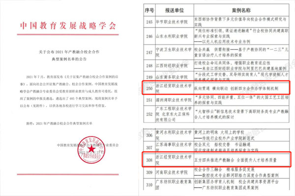 近日,中国教育发展战略学会产教融合专业委员会受教育部职业教育与成人司委托,发布了《关于公布2021年产教融合校企合作典型案例名单的公告》,遴选确定485个优秀产教融合案例。学校《纵向贯通 横向联动 创新四方合作办学体制机制》《五方四共推进产教融合 全面提升人才培养质量》两个案例成功入选,并将在全国范围内推广。