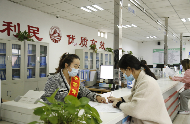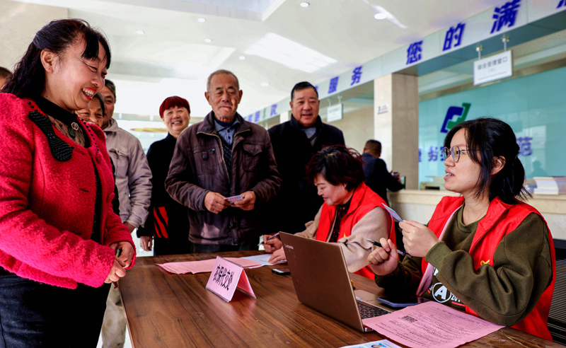 河北省邢台市襄都区宴家屯镇综合服务中心工作人员协助办事群众填写相关表格(2022年3月30日摄)。新华社发(张驰 摄)
