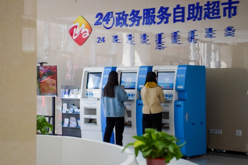 在内蒙古自治区呼和浩特市玉泉区政务服务中心的“24小时政务服务自助超市”,市民在自助办理发票业务(2022年4月2日摄)。新华社记者 李志鹏 摄