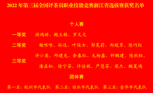 11月14日,2022年首届全国调饮师、第三届全国评茶员职业技能竞赛浙江省选拔赛在杭州余杭径山圆满落幕。